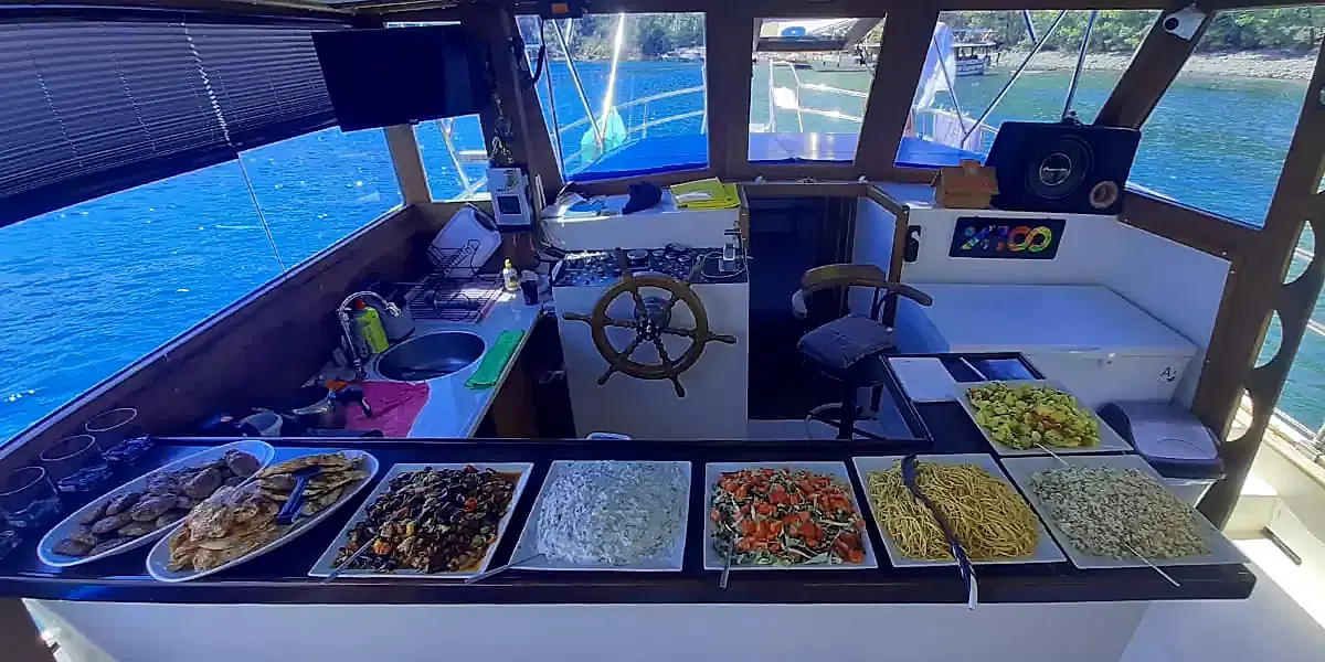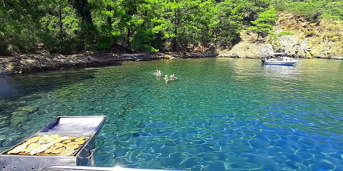After the Blue Cave, the tour continues to other bays and coves around Ekincik, selected based on daily conditions and group preferences. This region is known for its crystal-clear water, sheltered coves, and relatively uncrowded anchorages compared to many large resort areas. Several swimming stops are typically planned throughout the day, providing ample time for snorkeling, swimming, and sunbathing.Lunch and Comfort On Board
